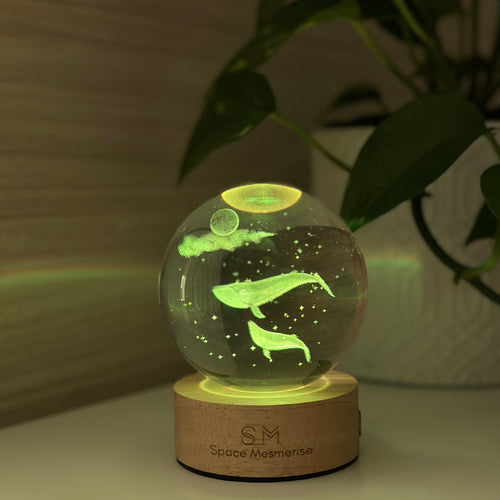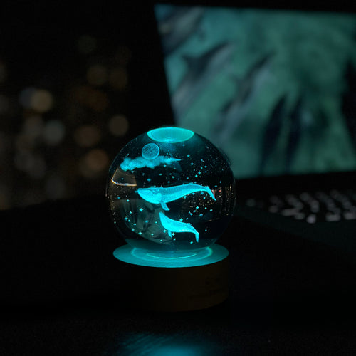 This engraved glass lamp is a striking combination of aquatic design with a space theme. Marine life in a night sky is a harmonious blend of tranquil and mystery that will dazzle any gift recipient.
